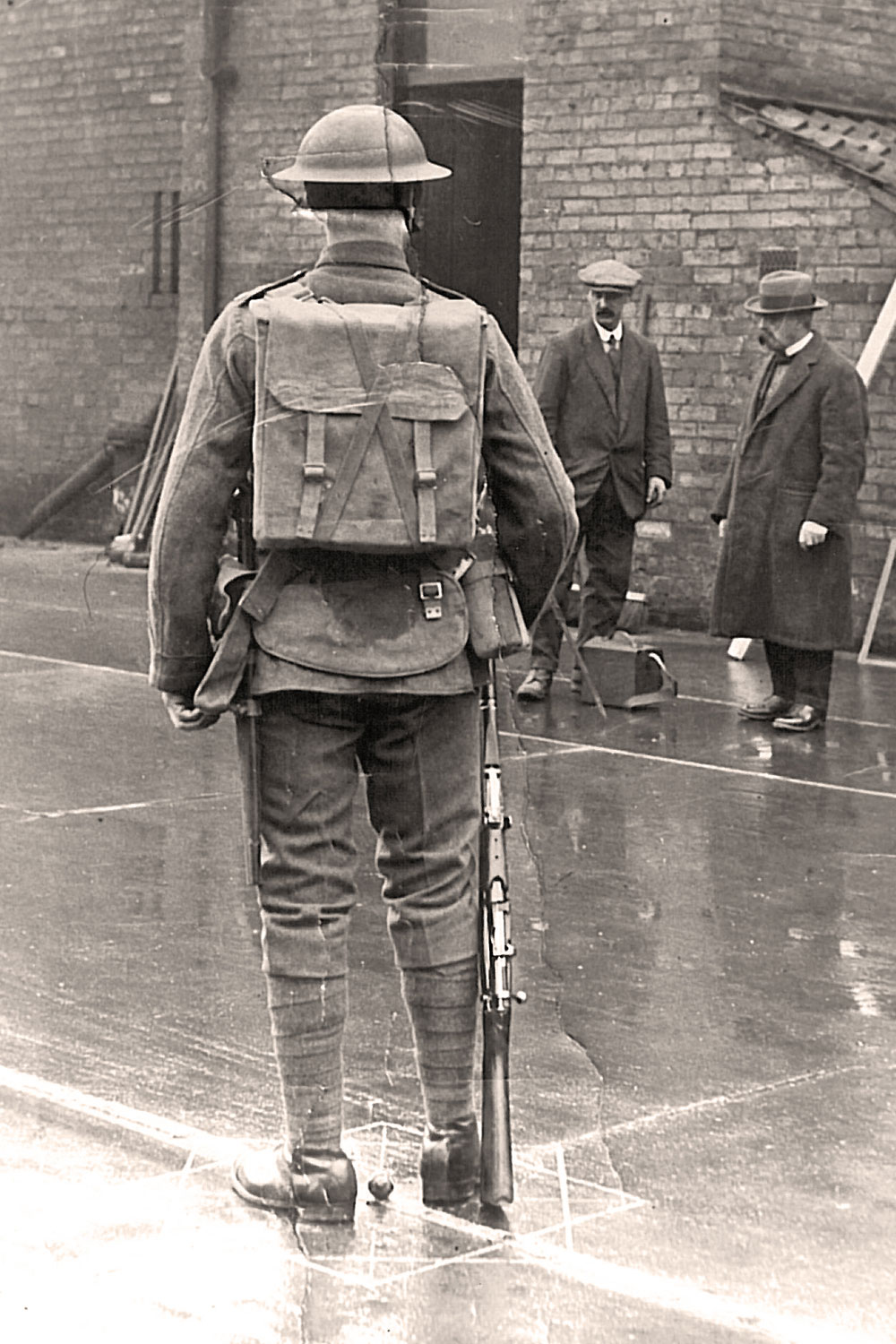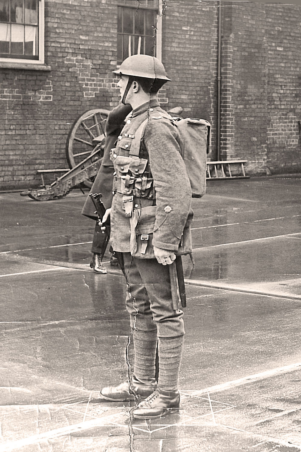The soldier on the plinth is ‘at least six feet in height’. Standing against a tree stump holding a rifle in his right hand in the at ease position, he was sculpted by Mr Robert William Ray of Fotherby. The original model was unknown until his daughter gifted his medals and photographs to the Louth Royal British Legion in the late twentieth century. The photographs show Regimental Sergeant Major George Frederick Jones posing in full service uniform and holding a Lee-Enfield rifle, almost exactly as he appears on the memorial. Sergeant Major Jones of the South Staffordshire Regiment, born in Wolverhampton in 1885, was stationed in Louth; he served throughout the 1914-18 war.