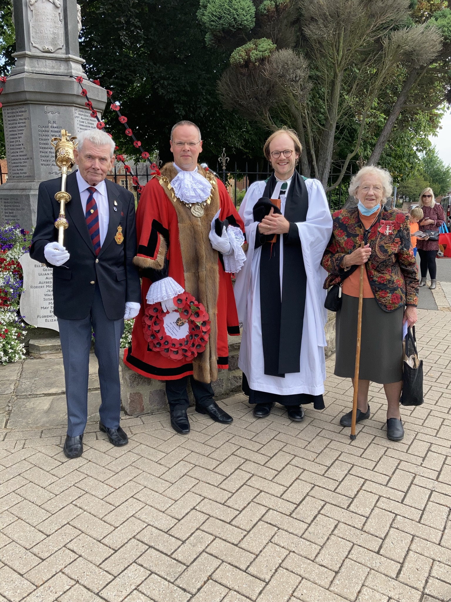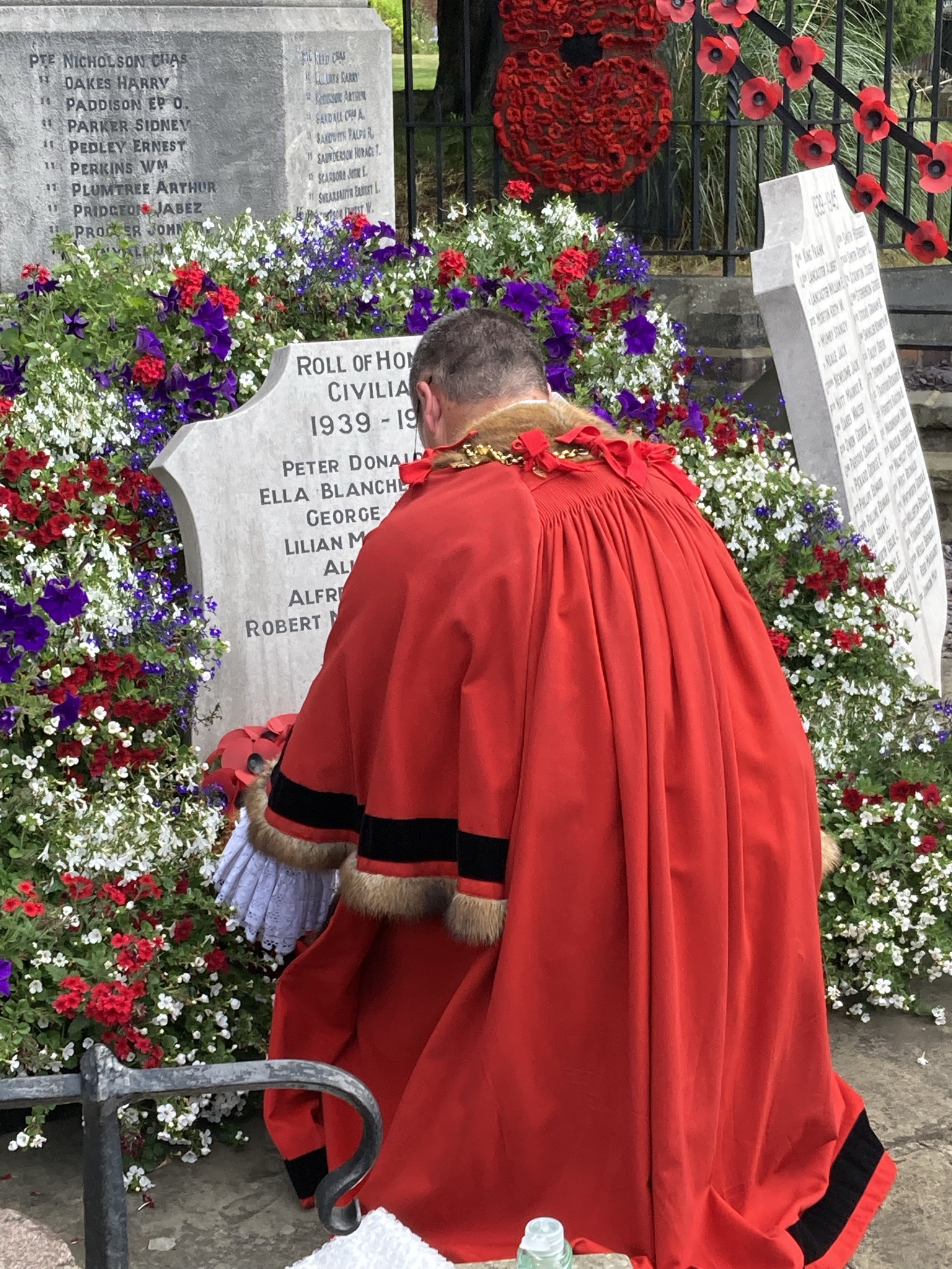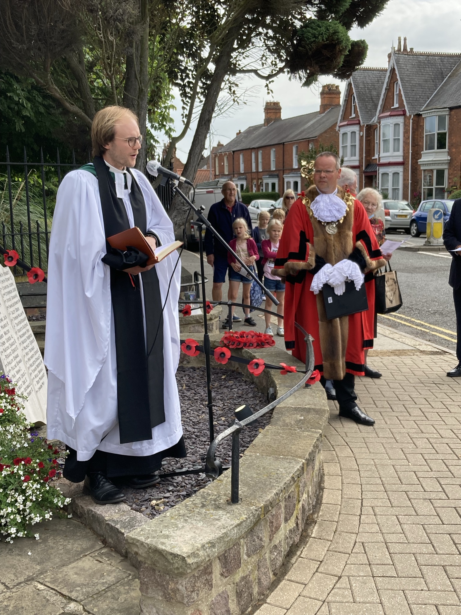 The 100th Anniversary of the unveiling of the War Memorial was marked today, the Mayor of Louth, Councillor Darren Hobson and the Secretary of the Louth & District Royal British Legion, Mr. Andy Warne both lay a wreath. The Rev’d James Robinson conducted the service and the blessing of the War Memorial.