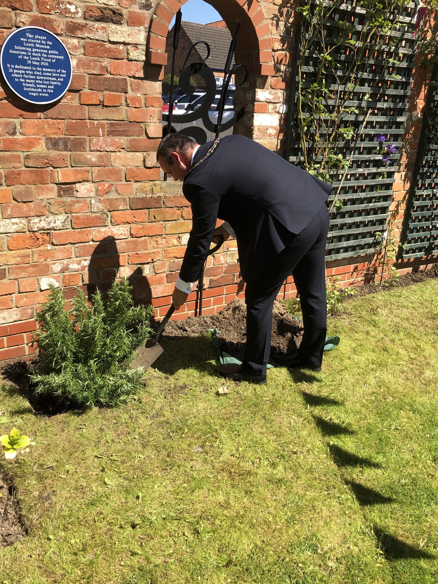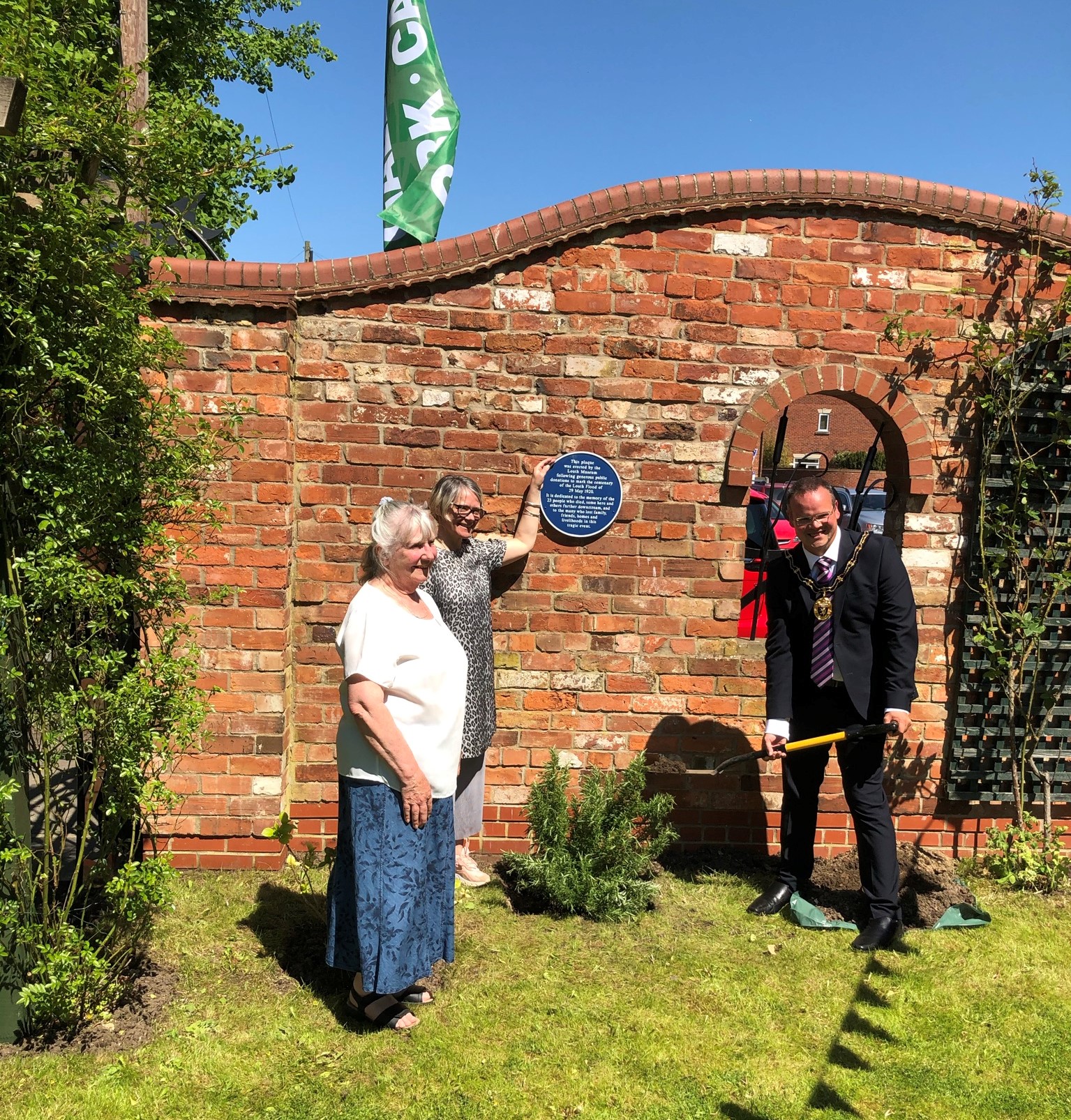 The Mayor of Louth, Councillor Darren Hobson unveils the plaque dedicated to those who not only lost their lives in the Flood in 1920, but whose lost family, friends, homes and their livelihoods. Anita Muchall (Louth Museum) tells of the significance of the rosemary bush also planted (often used on coffins at that time) and Jessica Mackett (Spout Yard Park) explains how Spout Yard was central to the devastation caused by the flood.